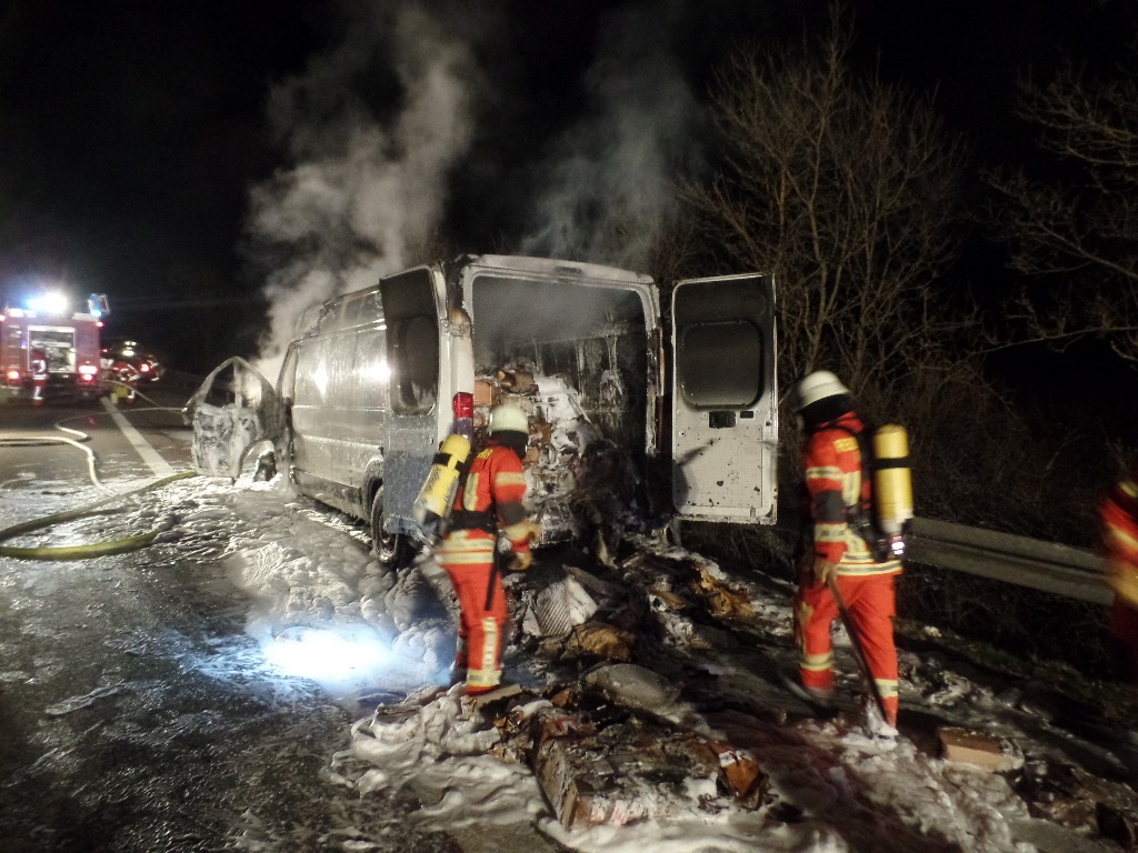 Am Dienstagabend wurde die Feuerwehr Engen zu einem brennenden Fahrzeug alarmiert. Beim Eintreffen der Einsatzkräfte wurde ein voll beladener Transporter im Vollbrand vorgefunden. Das Feuer wurde mir zwei Schaumrohren und eine C-Rohr gelöscht. Da die Ladung ebenfalls Feuer geladen hatte wusste das Fahrtzeug von zwei Atemschutztrupps entladen und abgelöscht werden. Parallel dazu wurde die Einsatzstelle abgesichert und ausgeleuchtet.